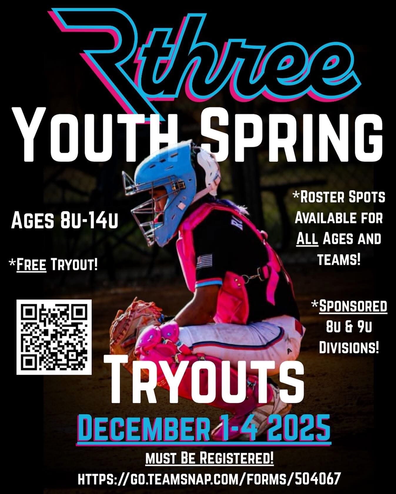 Please join us for your age group’s time slot on December 2nd, 3rd or 4th! Every player must be registered before trying out! Don’t miss your chance to join the R3 Family!